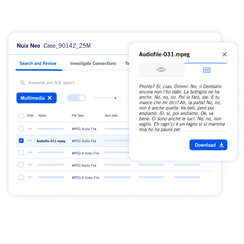 Nuix Neo’s advanced transcription turns audio and video into searchable, actionable data. With offline capabilities, multilingual support, and seamless integration with tools like semantic search, it empowers legal, privacy, and investigative teams to unlock insights and streamline complex workflows securely.